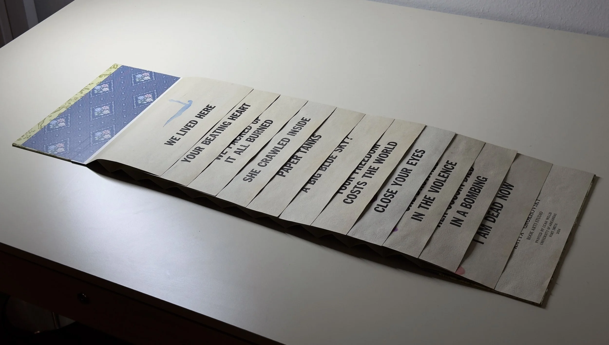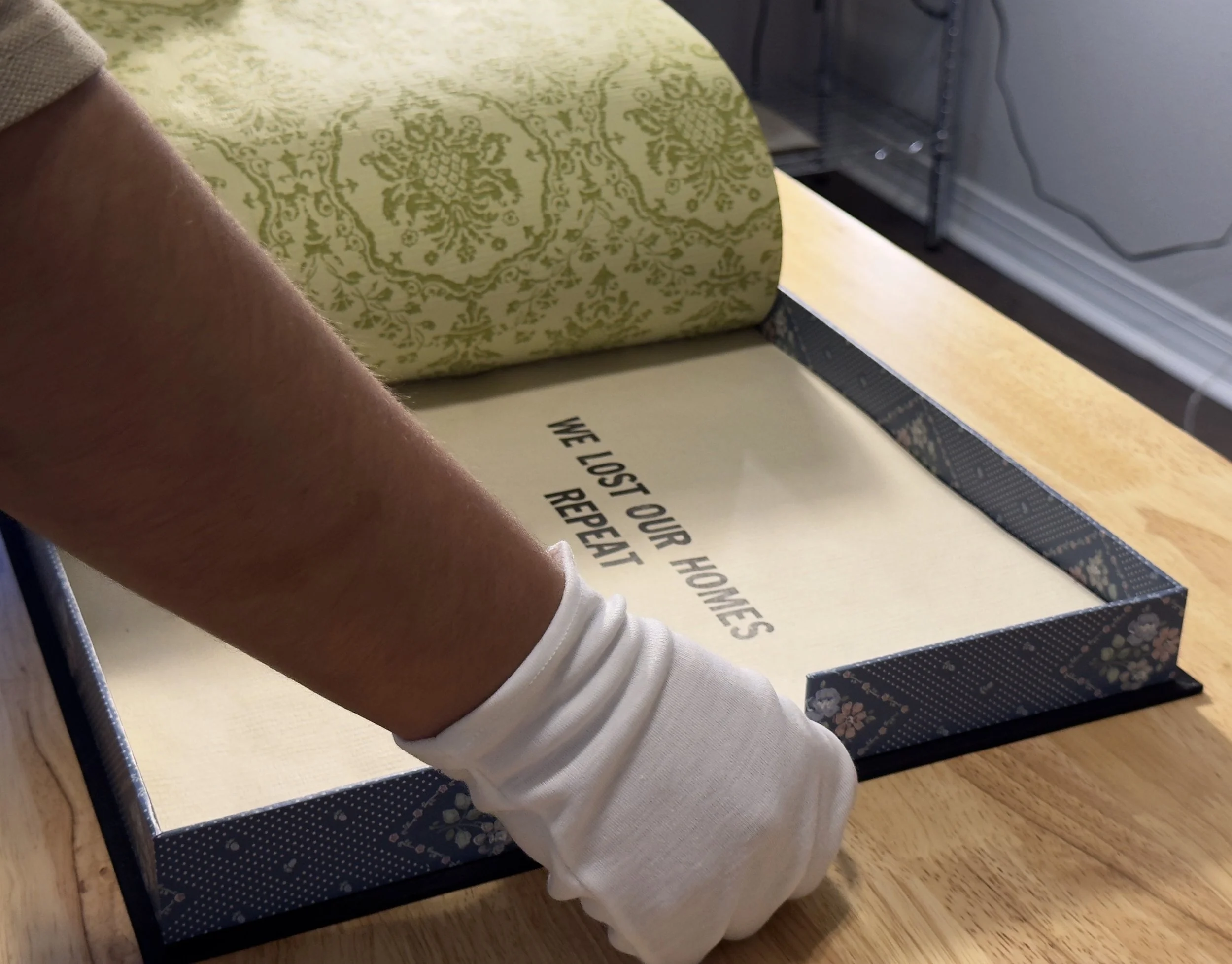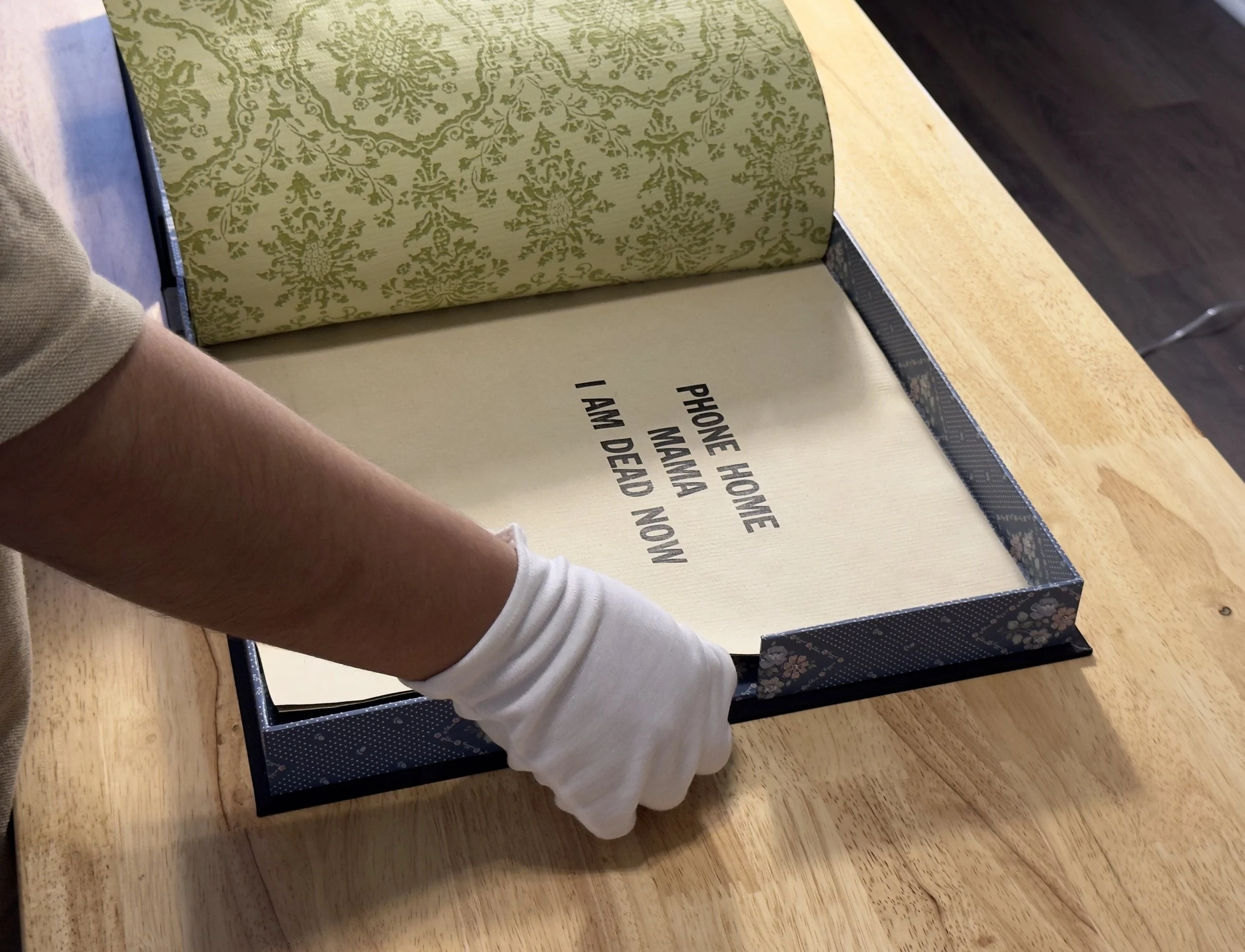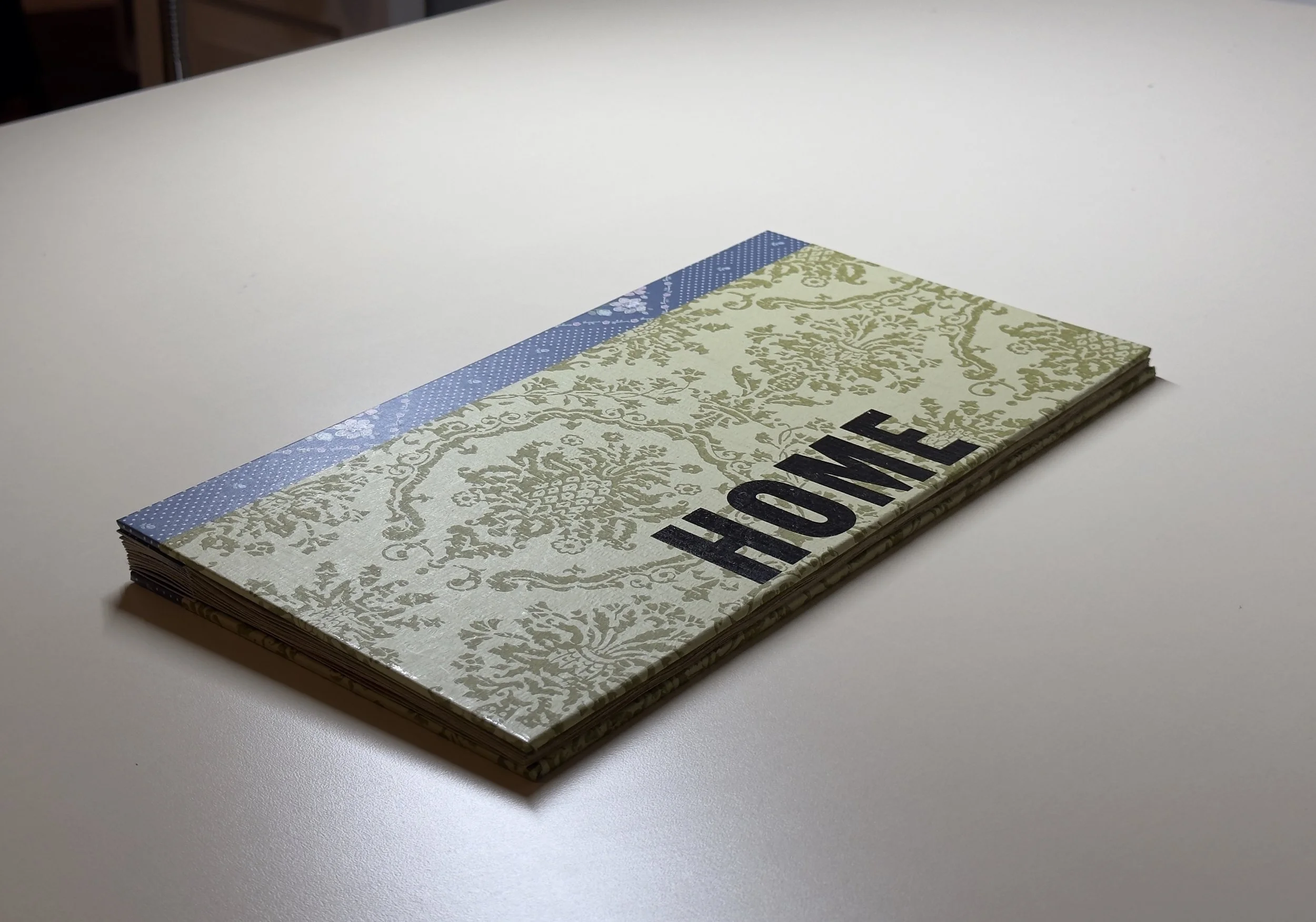 Artist books, 2024. Image 1-7:Phone Home, letterpress on coffee stained vintage wallpaper, fabric and wallpaper clamshell. Image 8-12: Home, letterpress on vintage wallpaper, ink stencil drawings, accordion style. Printed by Leah Willis at Book Arts Studio, University of Arkansas, Fort Smith. Supported by Windgate Foundation as part of AIR at UAFS, Spring 2024. Photos: Alex Dotulong.