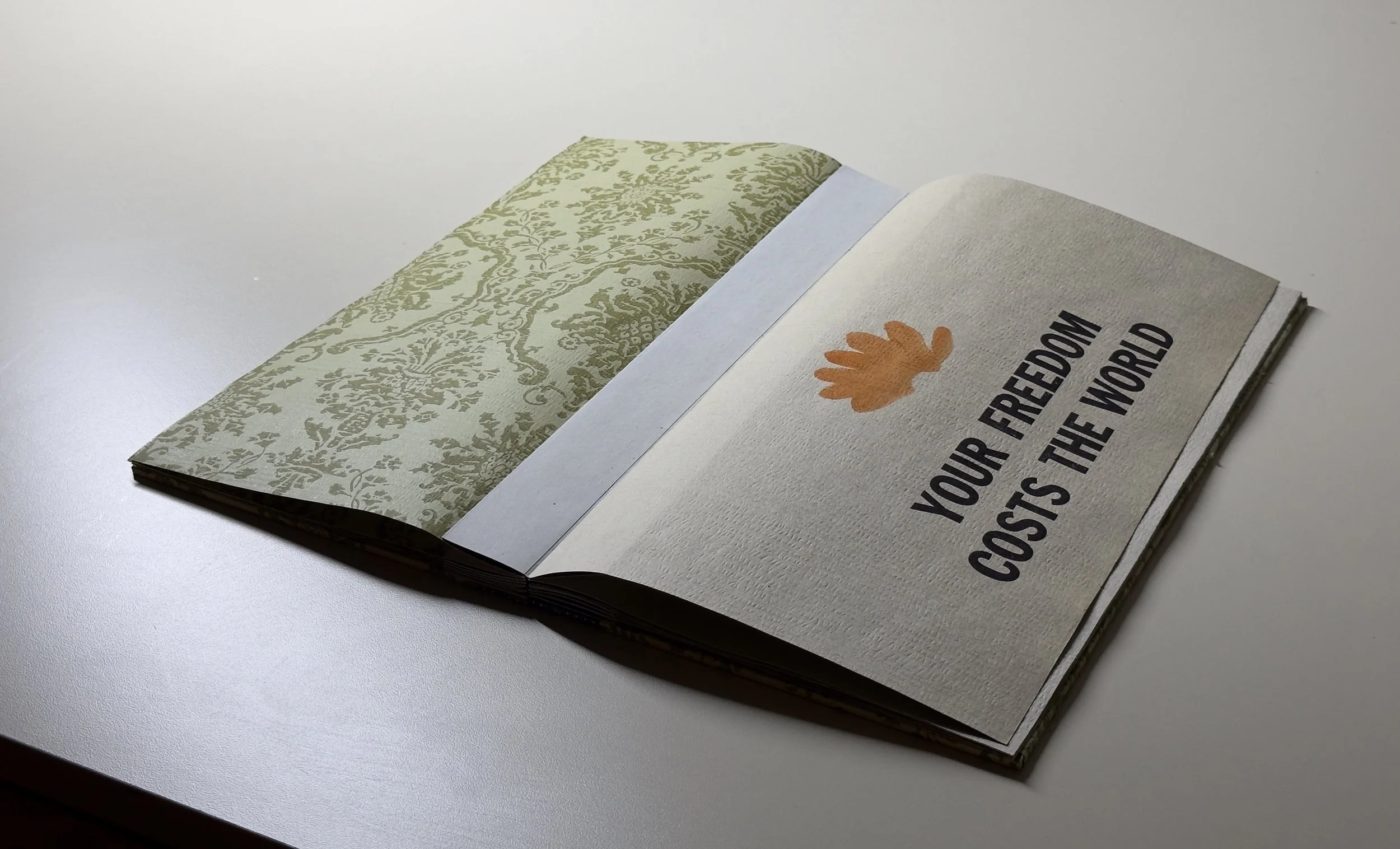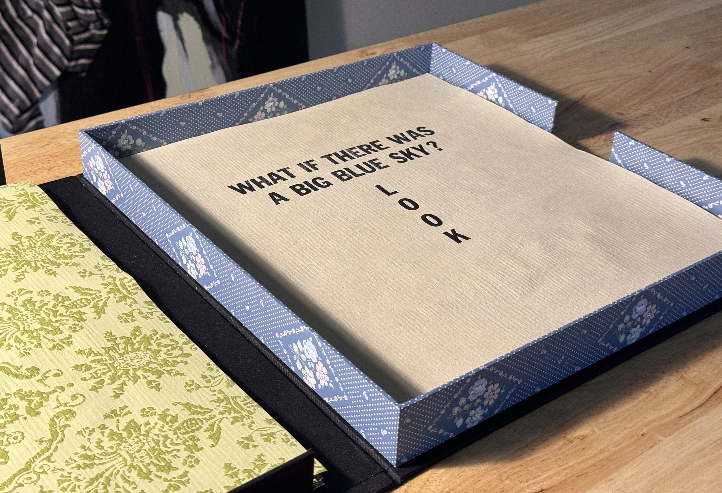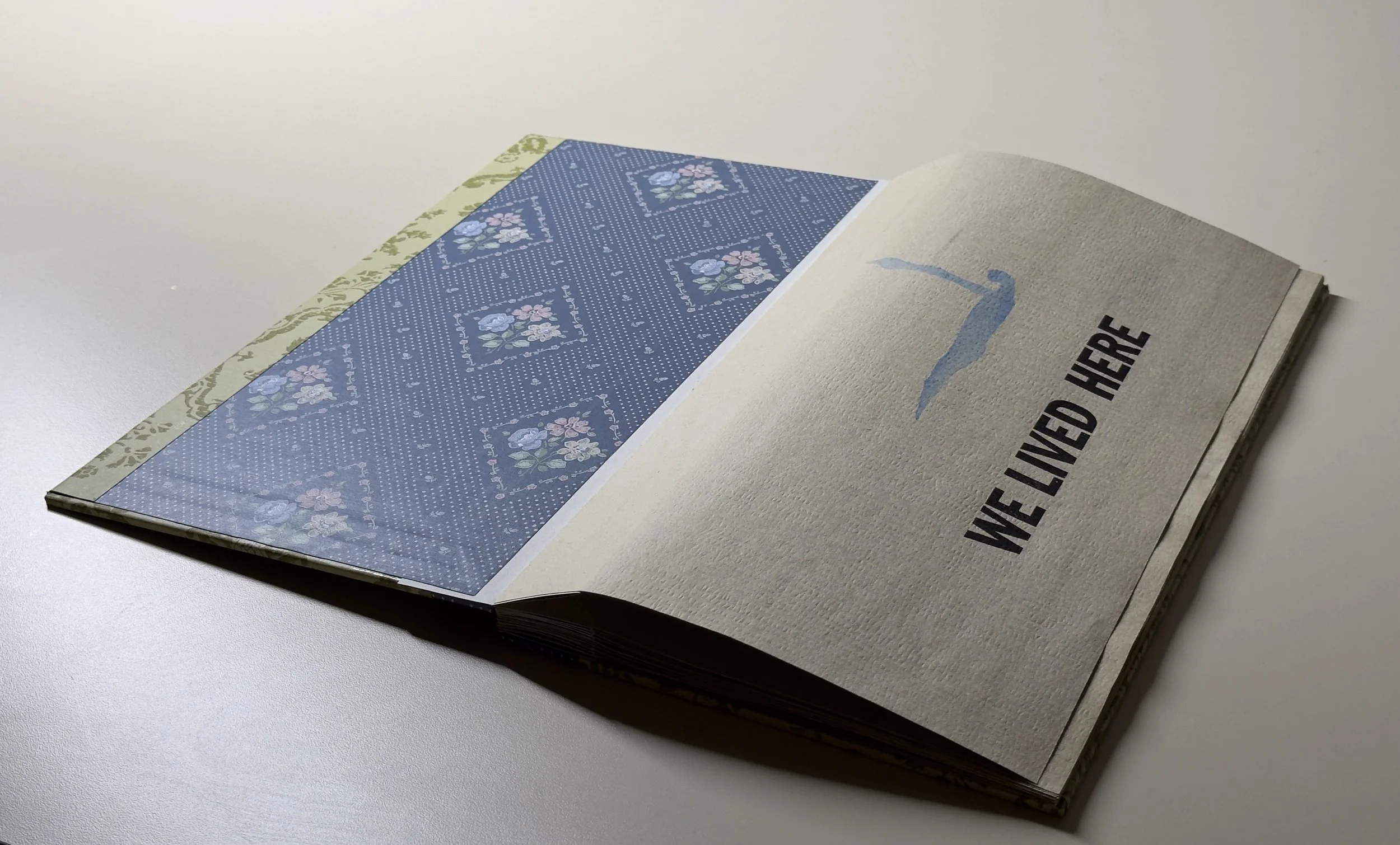 Artist books, 2024. Image 1-7:Phone Home, letterpress on coffee stained vintage wallpaper, fabric and wallpaper clamshell. Image 8-12: Home, letterpress on vintage wallpaper, ink stencil drawings, accordion style. Printed by Leah Willis at Book Arts Studio, University of Arkansas, Fort Smith. Supported by Windgate Foundation as part of AIR at UAFS, Spring 2024. Photos: Alex Dotulong.