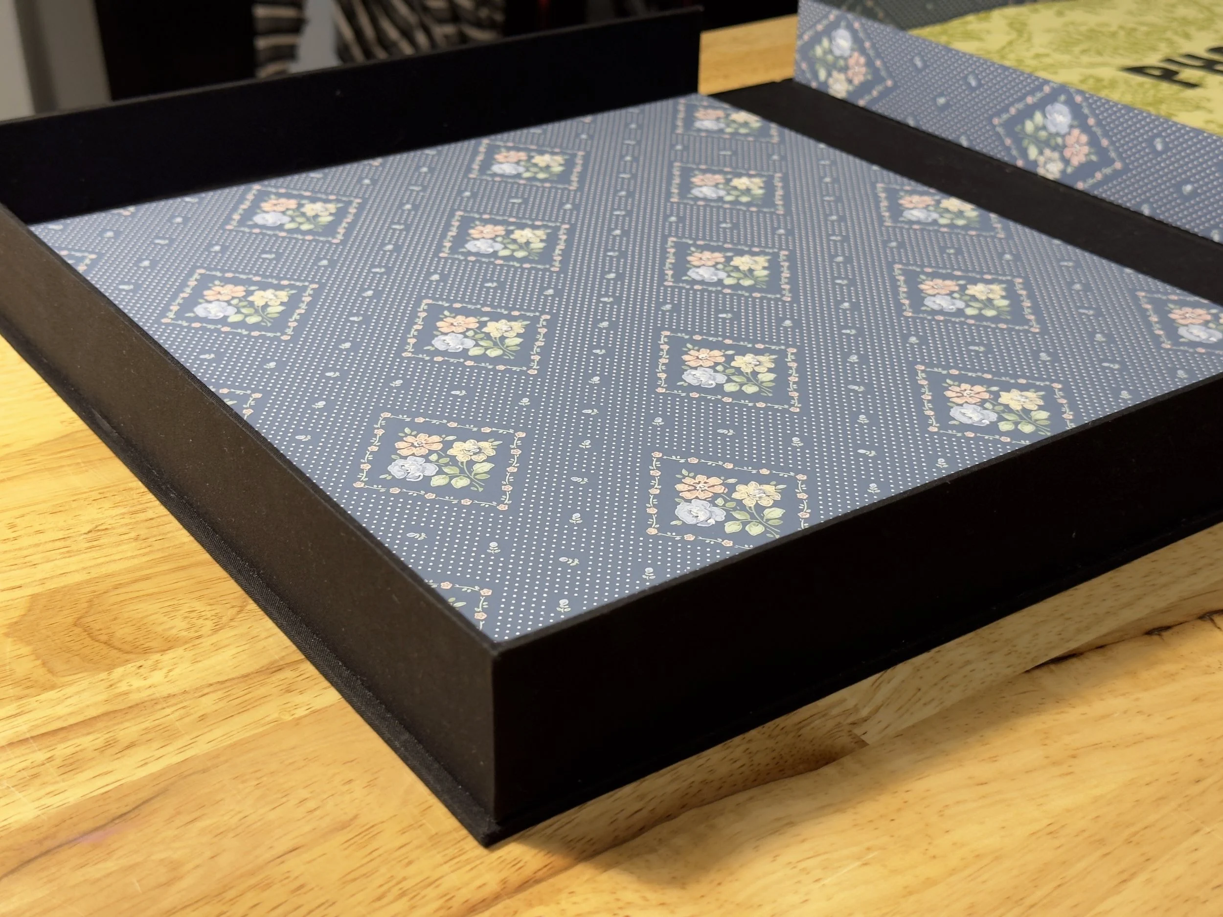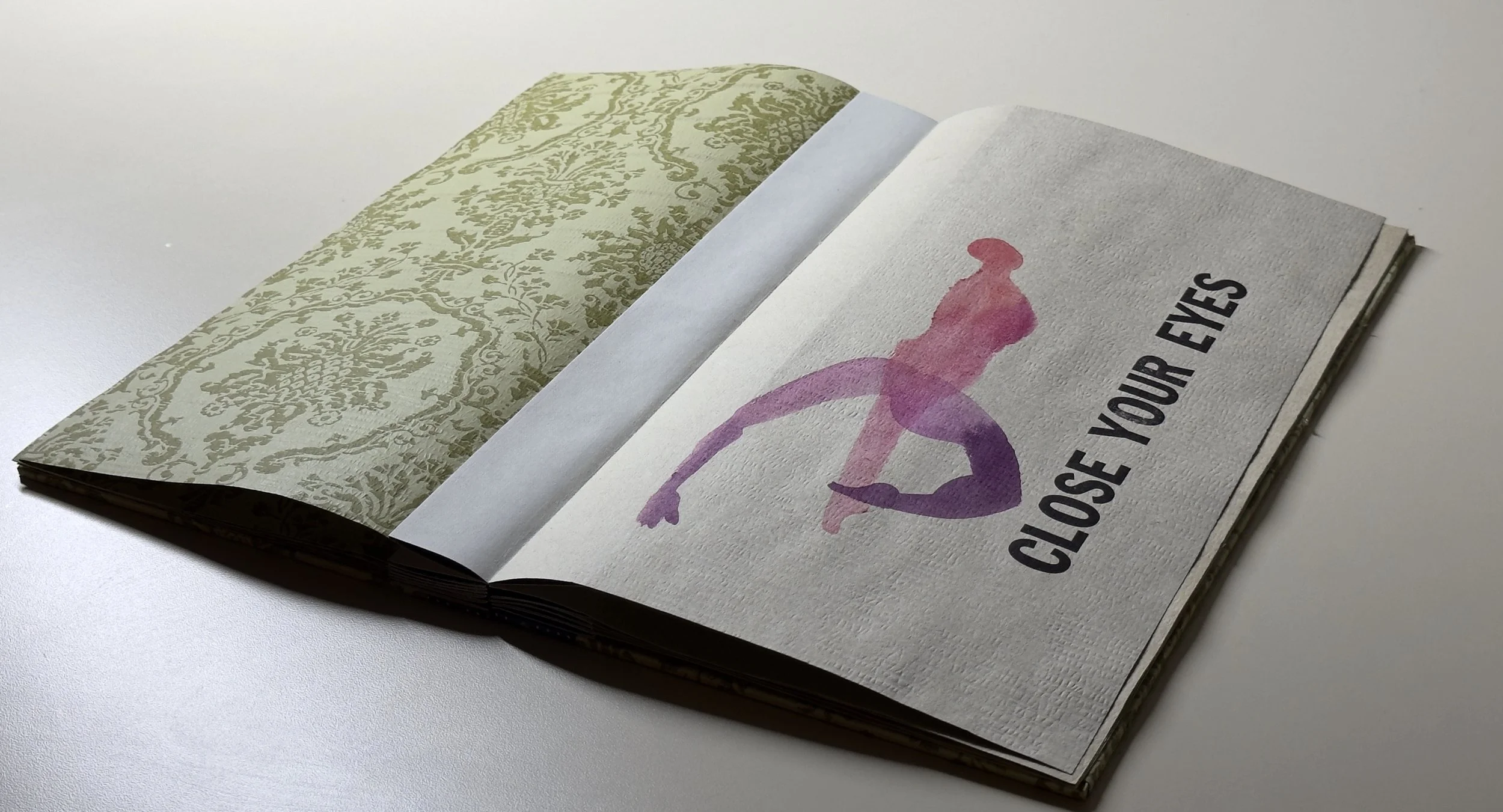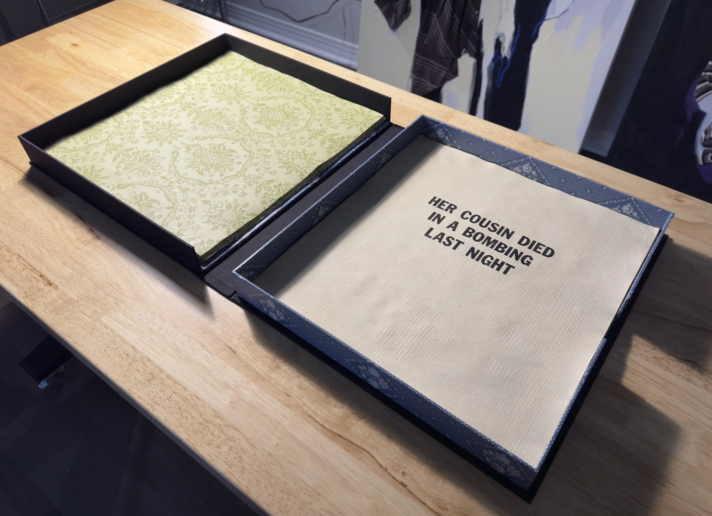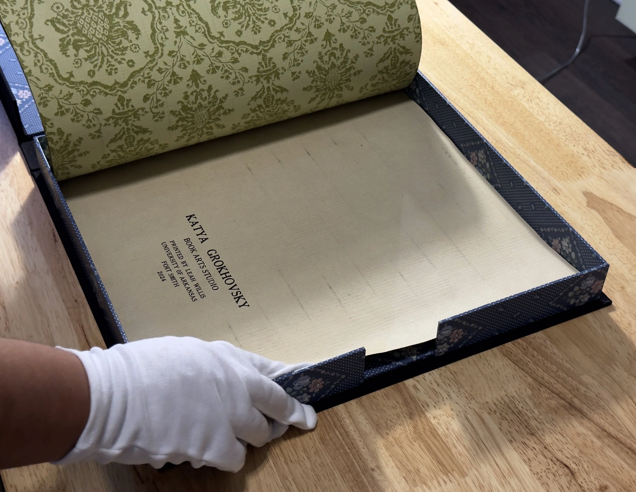 Artist books, 2024. Image 1-7:Phone Home, letterpress on coffee stained vintage wallpaper, fabric and wallpaper clamshell. Image 8-12: Home, letterpress on vintage wallpaper, ink stencil drawings, accordion style. Printed by Leah Willis at Book Arts Studio, University of Arkansas, Fort Smith. Supported by Windgate Foundation as part of AIR at UAFS, Spring 2024. Photos: Alex Dotulong.