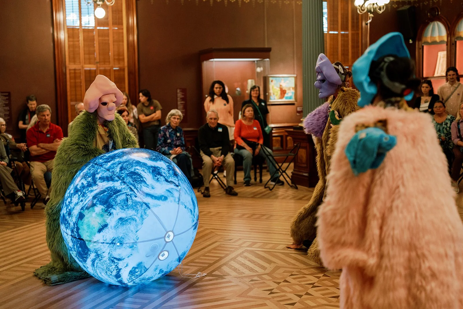Bad Woman (Laughing), 2025, 3D printed masks, fake fur, print on felt, beach ball, performance, sound, 45 mins. Performers: Katya Grokhovsky, Erica Rawson, Nadia Dean. Sound design: Kenzie Sitterud. Performed in the Ballroom at the Crocker Art Museum as part of Making Moves: A Collection of Feminisms exhibition. Sacramento, CA. Photos: Rachel Castro.