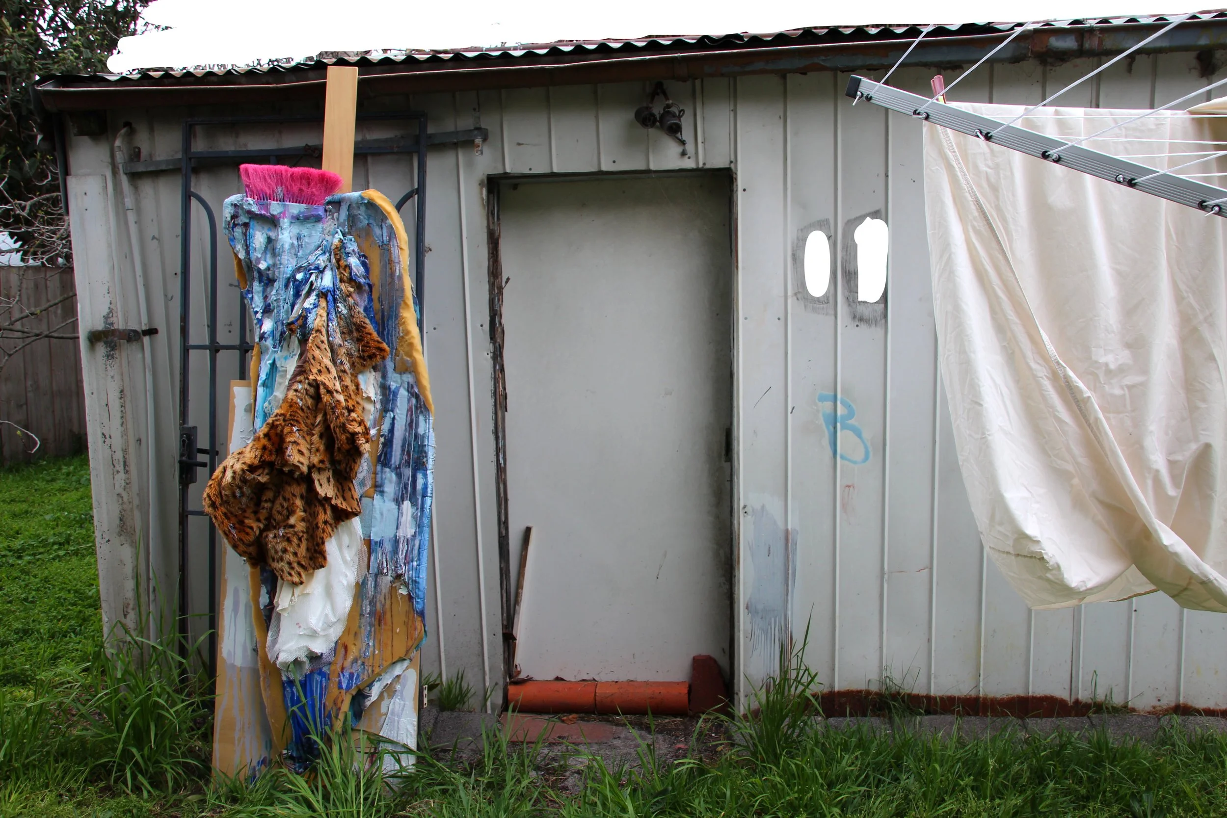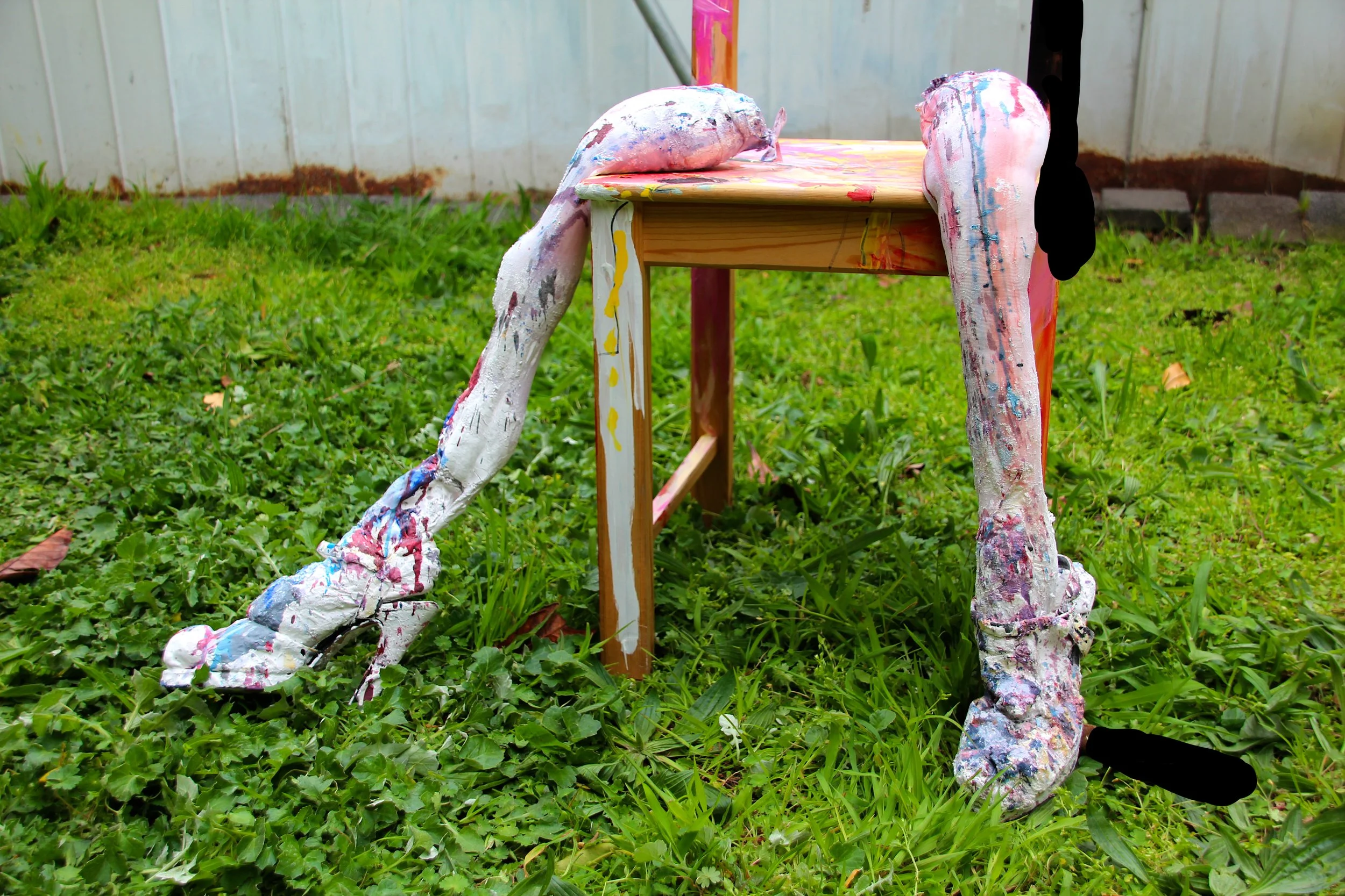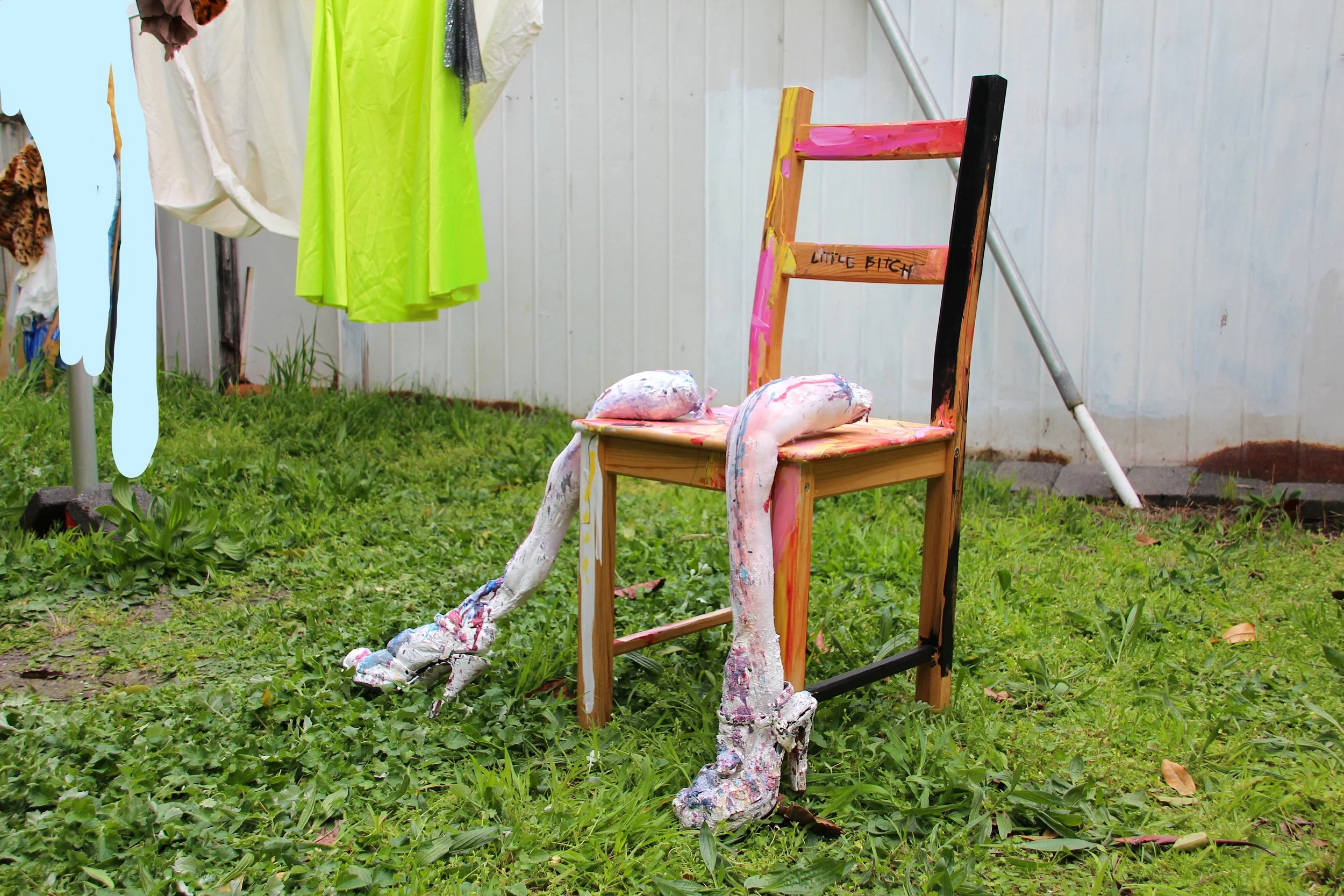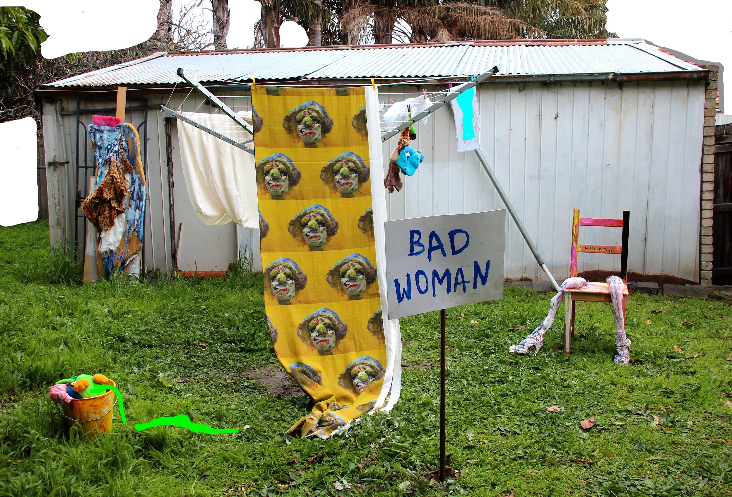 Bad Woman, 2017, plaster, chicken wire, acrylic, IKEA furniture, plywood, found objects, wig, paper, HD video. Seventh Gallery, Melbourne, Australia.