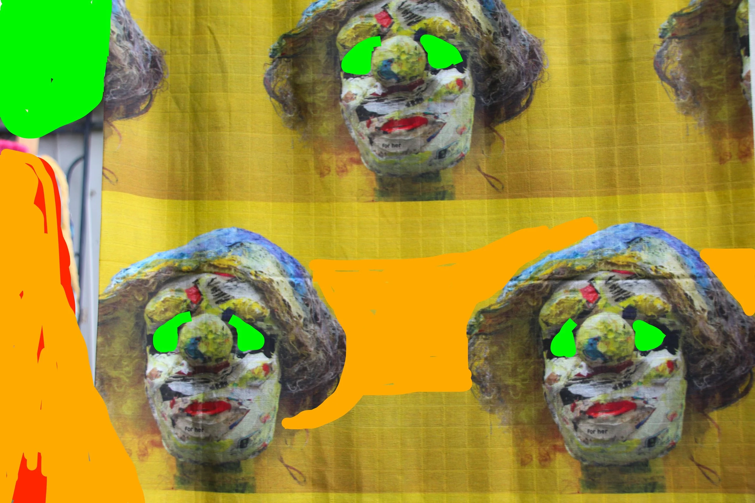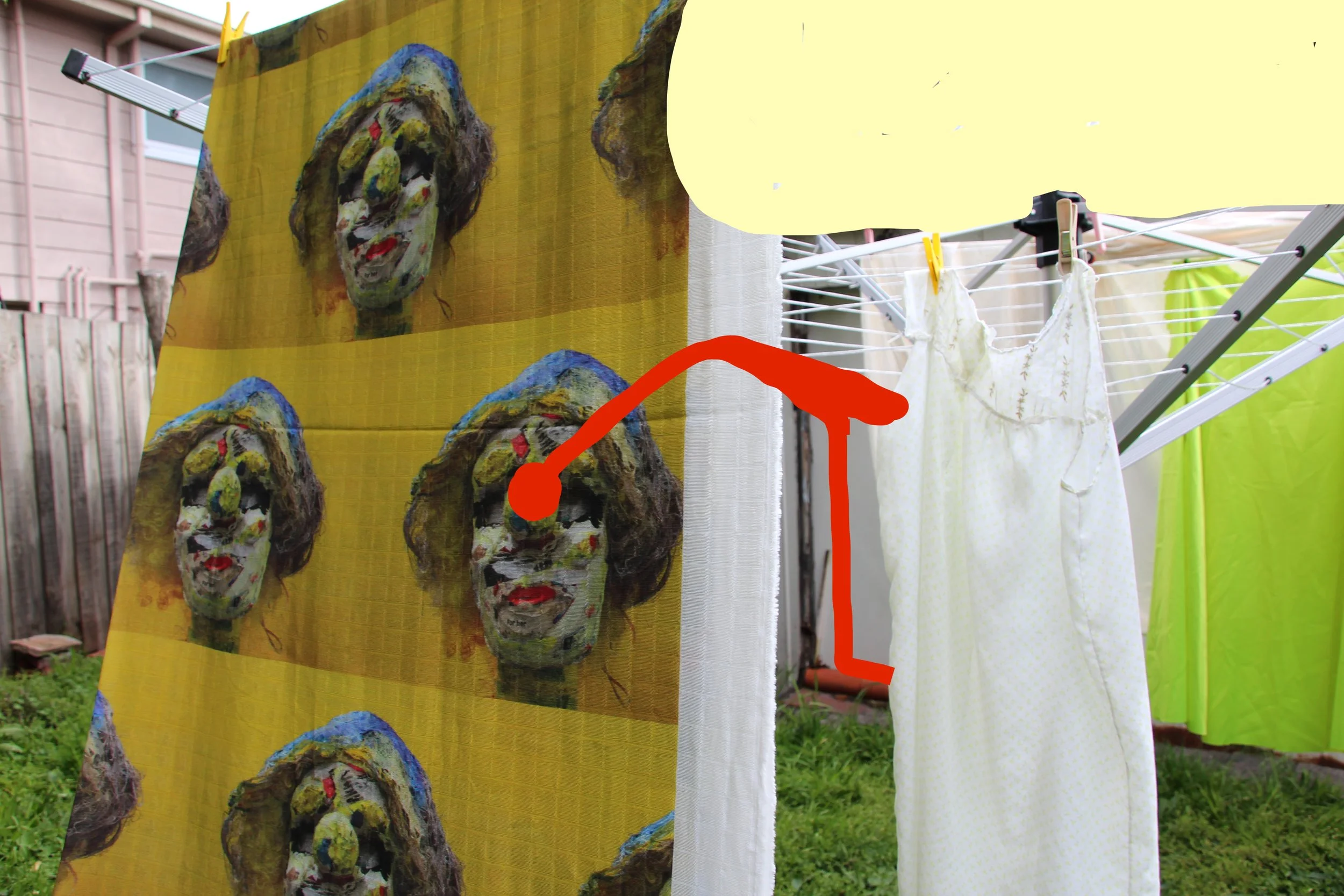 Bad Woman (lies here), 2017-2025, toys, bedding, towels, print on cotton, plaster, plywood, chair, shoes, acrylic, tights, digital drawing on digital photo.