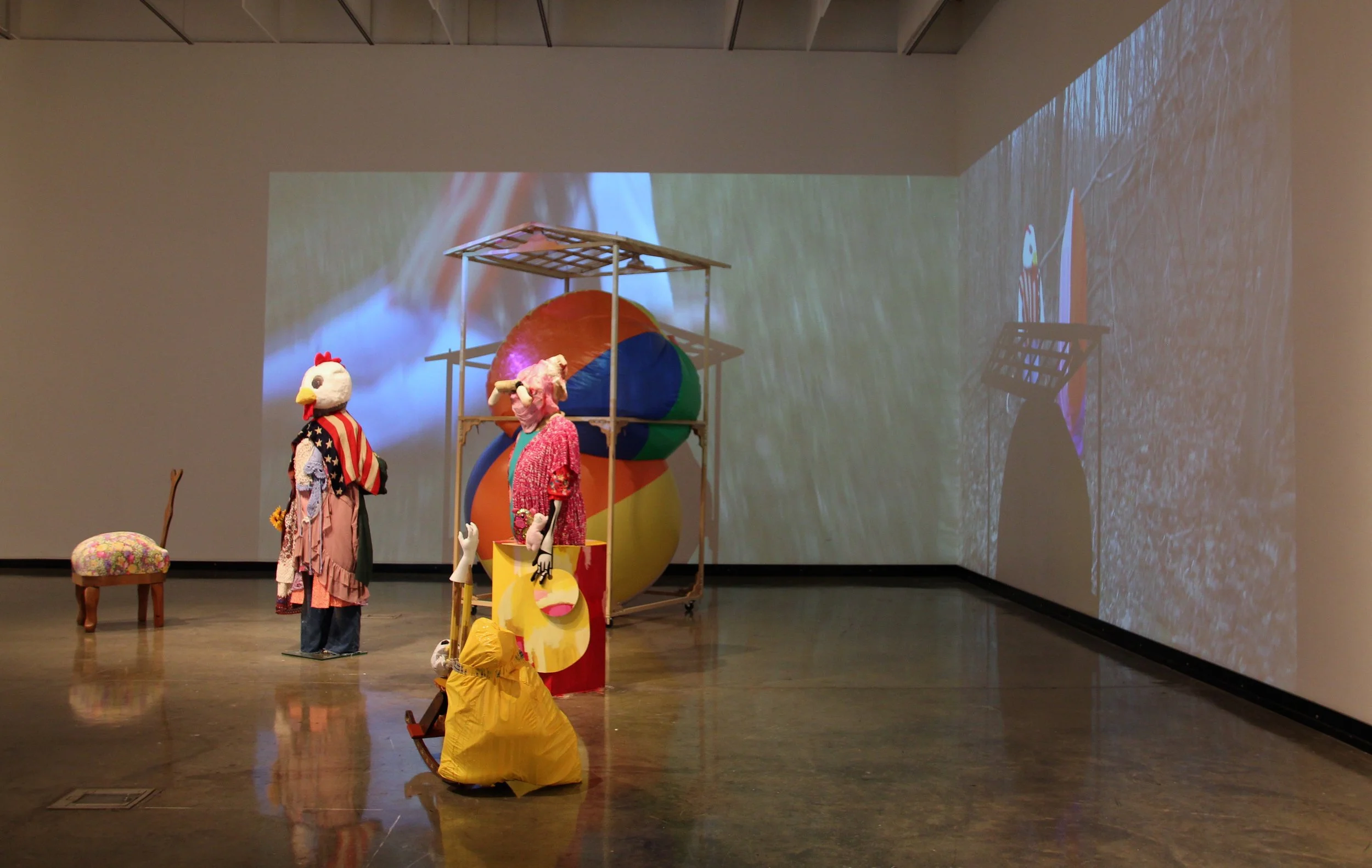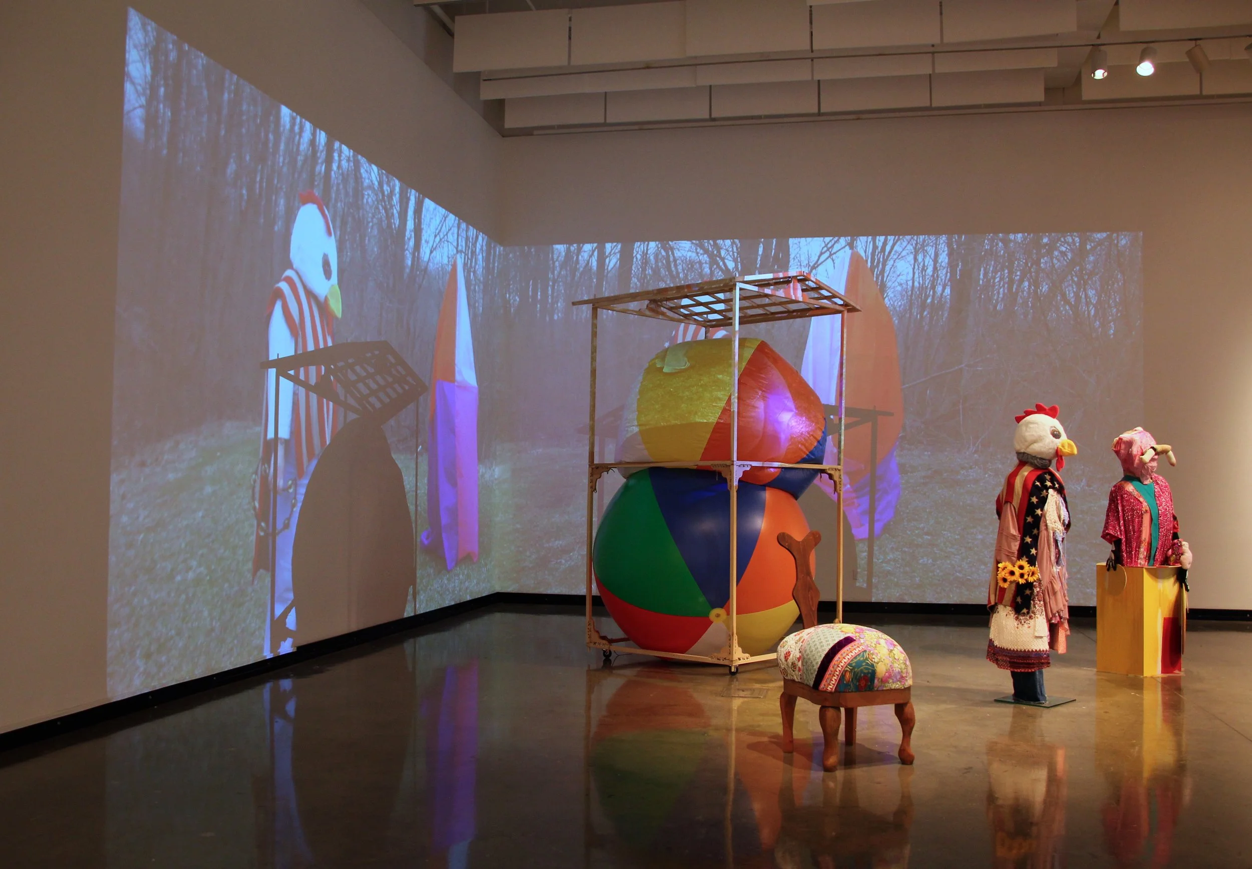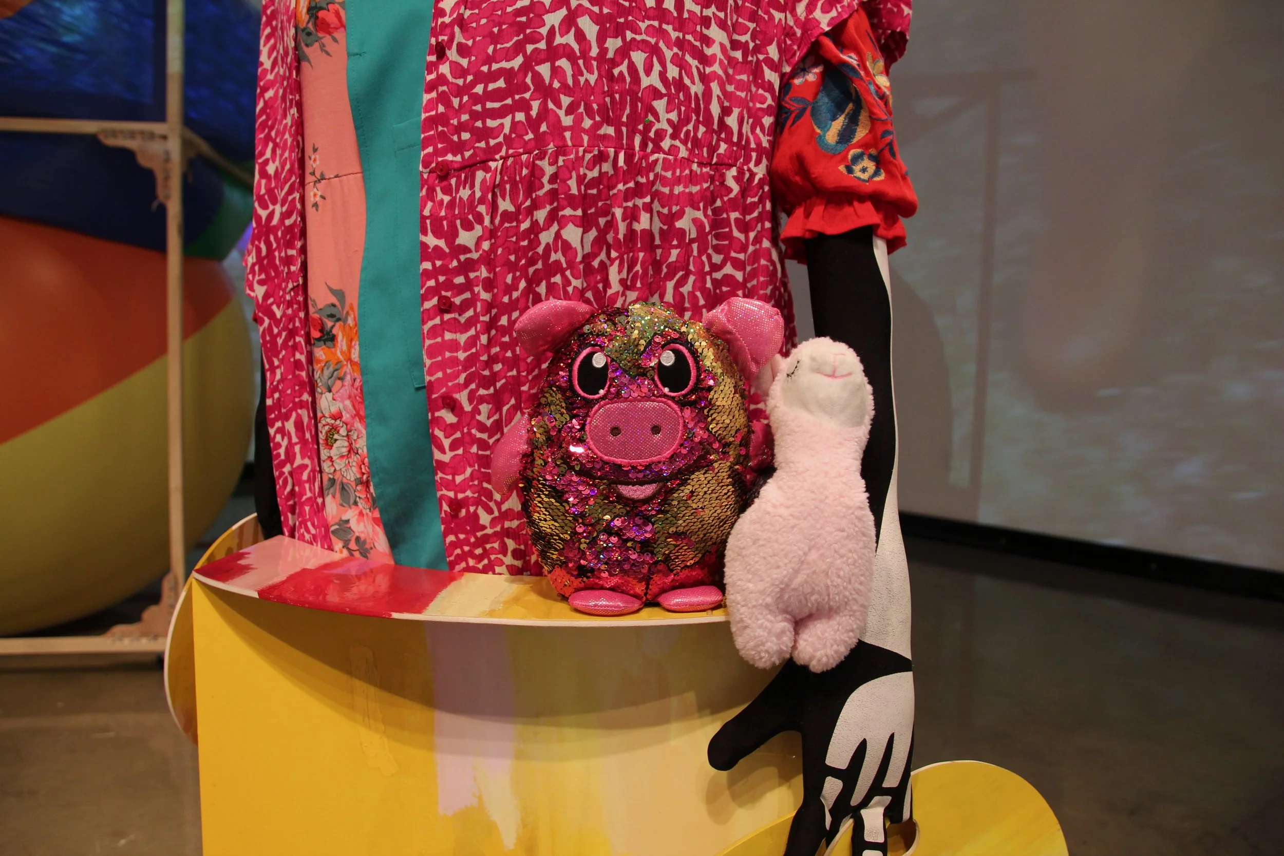 Common Language, 2025. Plywood, found wood, towel, quilt, leather, found objects, clothing, toys, acrylic, wall paint, epoxy, neon, beach balls, fabric, aprons, lace, foam, plaster bandages, canvas, wallpaper, print on peel and stick wallpaper, plaster, video. Photos::Travis Dodd. Sammie Saxon. Katya Grokhovsky. Illges Gallery, Visiting AIR at Columbus State University, GA.